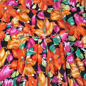Bold, bright, colorful floral prints, on black (pink, fuscia, orange, purple, green & white). Short, puffy sleeves. Round neck. Fitted bodice, with a yoke v waist. Pockets!! Flowy, pleated skirt. 5 buttons down bodice back & zipper at waist back, closures. Midi- maxi length. 100% Rayon. Dry Clean.