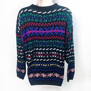 Classic 1980’s acrylic pullover sweater in black with uber-bright primary-colored geometric patterns (red, purple, green, yellow, white) in parallel stripes all over. Slightly oversized fit. By Cuddle Knit.