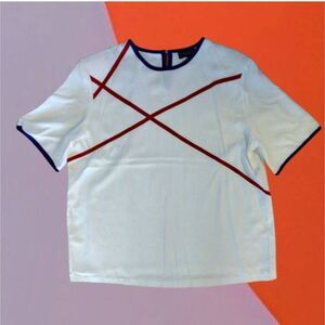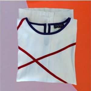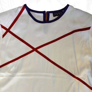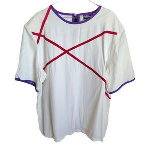 White, with abstract trim, in red & purple. Round neckline. Short sleeves, with attached shoulder pads (can easily be cut off, if desired). Keyhole button, closure, on back. 60% acetate 40% rayon