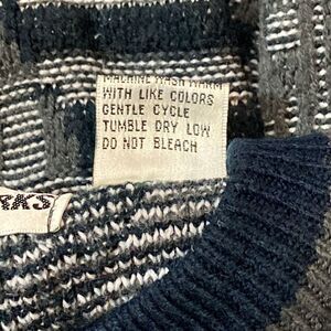 Stay warm and stylish with this cozy wool blend sweater. Featuring a unique geometric pattern in black and gray, this sweater is perfect for any casual outing.