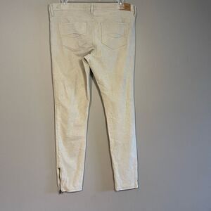Cute pair of Suede 'Jegging' style pants in cream from Abercrombie & Fitch, in a size 8. Featuring zip fly with front button closure, faux side pockets, two back pockets, belt loops, and zipper side hem detail.