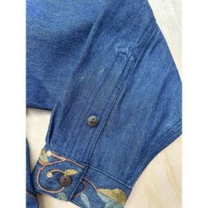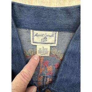 April Cornell Women's Jean Jacket is a vintage basic jacket made of cotton with beautiful embroidered accents of flowers and leaves. The jacket is size L and comes in a gorgeous blue color. It is perfect for women who want to add a touch of vintage style to their wardrobe.