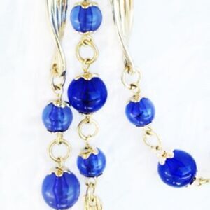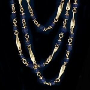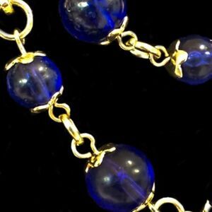 MID CENTURY BLUE GLASS BEAD AND GOLD TWIST FINDINGS TRIPLED LAYERED NECKLACE MADE IN KOREA. IT HAS BEAUTIFUL CLEAR DEEP ROYAL BLUE GLASS BEADS THAT MEASURE BETWEEN 5-10MM, THERE ARE 3 STRANDS OF BEADS, EACH BEAD HAS IT’S OWN BEAD CAPS AND ARE ATTACHED WITH JUMP RINGS TO EACH OTHER AND TO THE FLUTED GOLD TWIST FINDINGS. THE FIRST LAYER MEASURES 24” IN LENGTH , THE MIDDLE 27” AND THE LONGEST LAYER IS 30” .REALLY A STUNNING NECKLACE AND ONE THAT YOU AN BUILD AN OUTFIT AROUND.