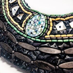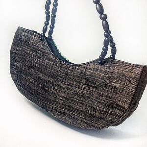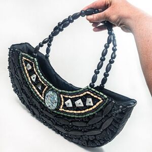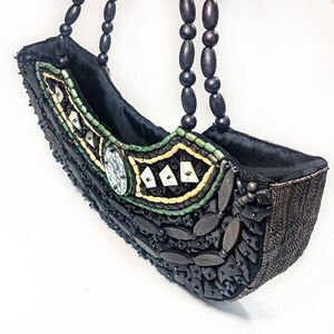 Unique vintage beaded handbag in a galleon/crescent shape, front side embellished with wood, coconut shell, and abalone on a darkened burlap.