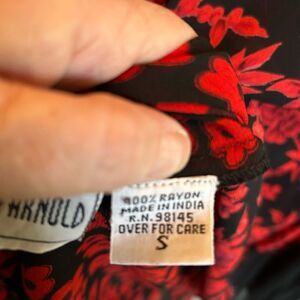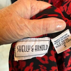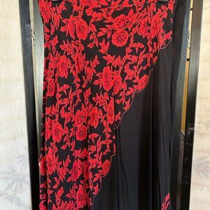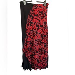 Shelly & Arnold reversible maxi skirt. It's black and Red one side and features a red floral print on the other. The skirt has an elastic waistband and is made of 100% rayon. It is a layered maxi skirt, offering two different looks in one garment. The skirt is designed to be lightweight and is machine washable in cold water and should be line dried.