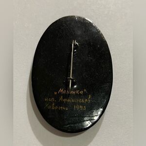 Vintage signet hand painted Russian lacquered oval brooch featuring a girl with long braided hair wearing a red dress and a beautiful headpiece. Pin back closure in good working order. Signet: «Малинка» исп. Афанасьев Ховрино 1993 “Raspberry” executor Afanasev Hovrino 1993