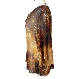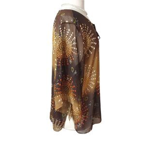 sheer chiffon top, long sleeve blouse, vintage, vintahe, 60s, nature, hippie, women's fashion top, elegant blouse, stylish shirt, chiffon blouse, sheer top, lightweight blouse, women's top, tie-neck blouse, Brittany Black blouse, firework pattern shirt, brown and orange blouse