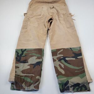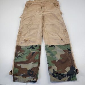 Preloved overalls in fair condition with signs of wear and discoloration shown. See pictures for more details and measurements. Feel free to ask any questions. Size tag is missing. The camo is a customized.