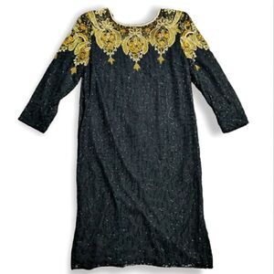 VTG Carolyne Barton Night pure silk Black Gold beaded 3/4 sleeve dress size M