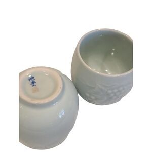3.¾" x3" | Set of 2 Vintage Chinese/ Japanese? Celedon Footed Teacup or Sake Cup | Embossed Grape Leaves Design | Signed & Stamped | Excellent Vintage Condition | glossy finish | Please refer to photos for condition. | Set weight is 1.4 lbs. Before packaging
