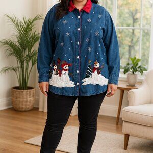 Charming denim shirt featuring snowman embroidery. Red collar adds a festive touch. Perfect for winter wear.