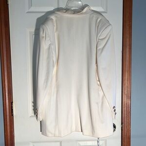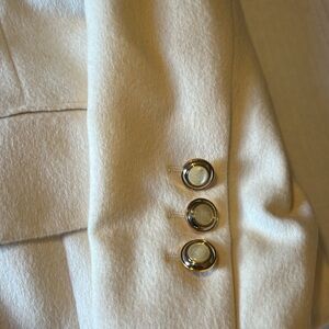 VTG-ESCADA Margaretha ley-12(44)-cream-angora wool blend, lined, blazer/jacket. Made in Italy. three buttons to close on front. Shoulder pads. Three buttons on each cuff. Single breasted. Soft. 55% angorawool, 45% new wool. Missing part of one button see last photo,not noticeable. See photos for approximate flat measurements. Quiet luxury, preppy, office siren. Boardroom, academia