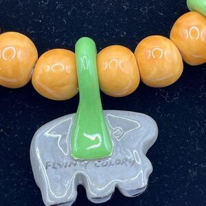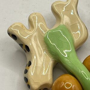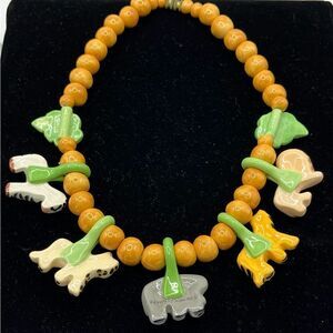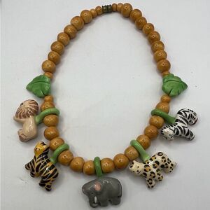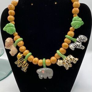This necklace consist of 5 safari animals, a lion, tiger, elephant, leopard and zebra. It also is flanked by two green leaves and tan colored beads, This necklace is amazing and in great VTG condition, looks like it was never worn. The only issue it has is some crazing that happens with age, but no chips. 18” long.