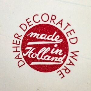 Two tin salad plates stamped “Daher Decorated Ware, Made in Holland.” Each is 8” across, painted in off-white with burgundy and gold fruit motif. One plate has a scratch (see pic).