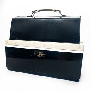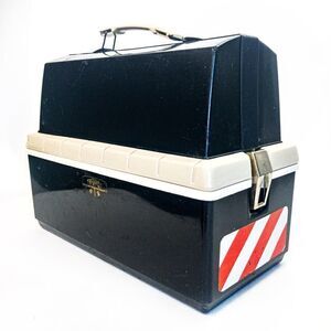 Vintage black plastic cooler kit lunch box with 2-cup vacuum insulated beverage container in mustard yellow/orange, by King-Seely Thermos.