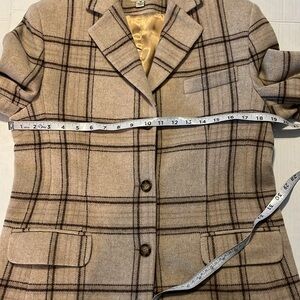 VTG-L.L. Bean-8 Reg-tan plaid-long sleeve, wool& cashmere blend, blazer/jacket. fully lined, soft. Two flap pockets in front. Buttons on the cuffs. Three buttons down to close. Notch lapel. 80% wool, 20% cashmere. Lining-100% acetate. See photos for approximate flat measurements. Excellent vintage condition. Academia, career, professional, preppy.