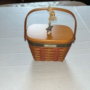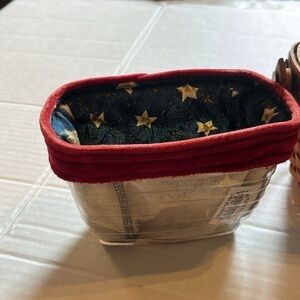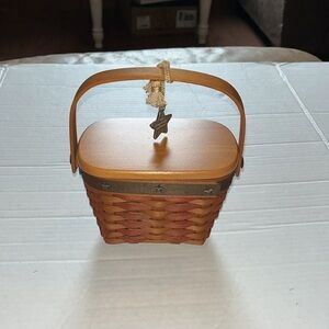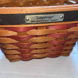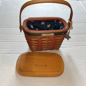 VTG-Longaberger 2001 inaugural basket, in honor of President Bush. basket liner, lid, tie on protector inaugural Star. Red white and blue patriotic. 6.75”x 7.5”x4”. very good condition.