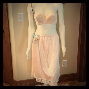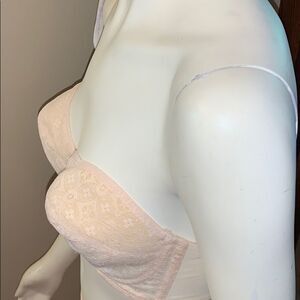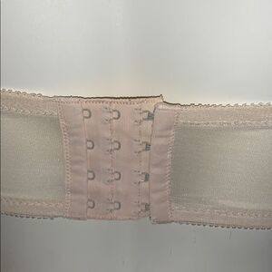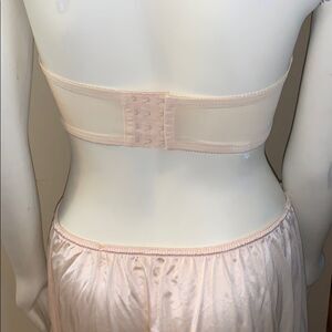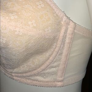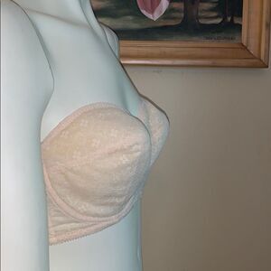 ILGWU strapless vintage lace bra. Strapless pointed fit. Pretty cream pink color bow center. Wide width four hook back closure. Faded size label. Size 32D/34D-32DD. Please see photos for measurements. Great vintage condition.