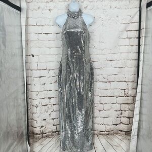 ✨Features: Fully lined, lower back zip, double button halter, fitted with little stretch so be sure to check measurements. Totally glam!