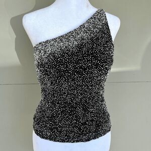VTG Scala Beaded Silk One Shoulder Asymmetrical Top Black Silver M