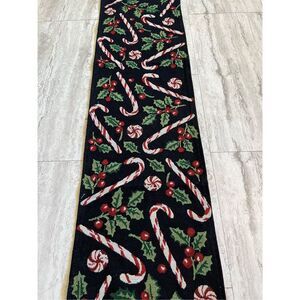 VTG Woven Black with Candy Canes and Holly Runner Tabletop Kitchen 12.5" x 69.5