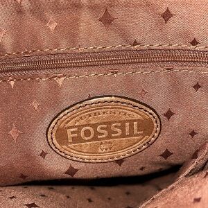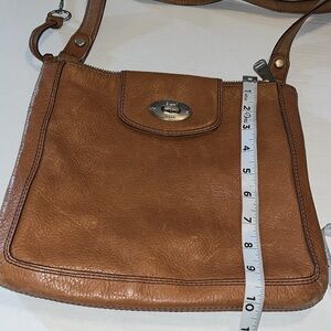 VTG-fossil-Boho, Marlow Crossbody- Chestnut brown)-pebbled leather, Crossbody purse/bag. two compartments accessible from the top, one zipper& one twist and lock. Silver hardware. Inside two slip pockets and one zipper pocket. Buckle on for adjusting. Fossil key. very good vintage condition except for two marks on back see last photo. 11 inches wide, 9.5 inches tall, 2 inches deep. See photos for approximate measurements. Boho, retro.