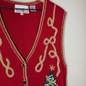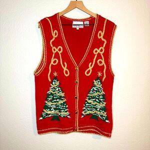 Red sweater vest with Christmas tree design and gold accents. Perfect for holiday celebrations.