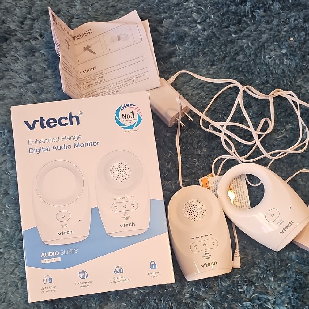 Like new. Used for only a month. VTech digital audio monitor set with enhanced range. Includes two white monitors and a charging cable.