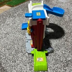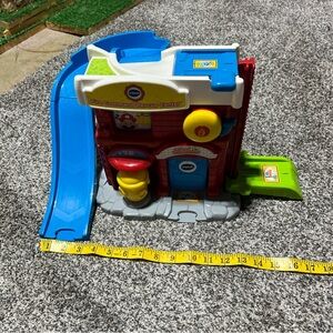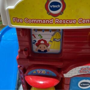 This is a VTech Go! Go! Smart Wheels Fire Command Rescue Center toy. It is a preschool toy and can be used for pretend play. The toy has been well-loved and is still in good shape.