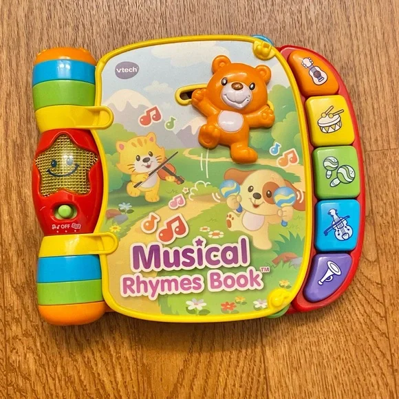The Vtech Musical Rhymes Book comes in a vibrant red color and requires 2 AAA batteries for operation. It is compatible with both genders and is perfect for children who want to learn and play music. The book's dimensions are 1.74 x 8.76 x 7.48 inches, and it weighs 1.11 pounds. Get your child's development rolling with the Vtech Musical Rhymes Book.