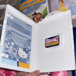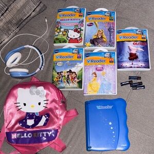 Adorable Hello Kitty backpack in vibrant pink, perfect for kids. Features a cute Hello Kitty design, ideal for carrying small accessories. This bundle includes 5 vtech reader games, one hello kitty back pack, one set of headphones (frozen theme) and a vtech reader that I couldn’t get to work. I’ll include it for free to see if you can get it working.