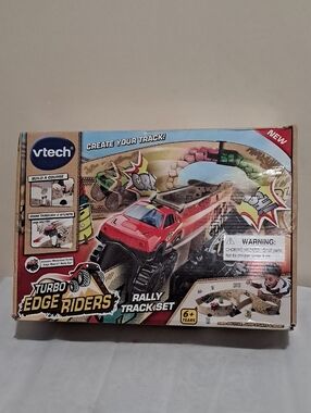 VTech Turbo Edge Riders Rally Track Set in red. Fast motorized monster truck play with buildable track pieces. Includes stunt-ready vehicle for dynamic racing and creative course design. Bright red color adds bold excitement to playtime. Condition New Please Check Out All Photos (Packaging Shows Some Wear)