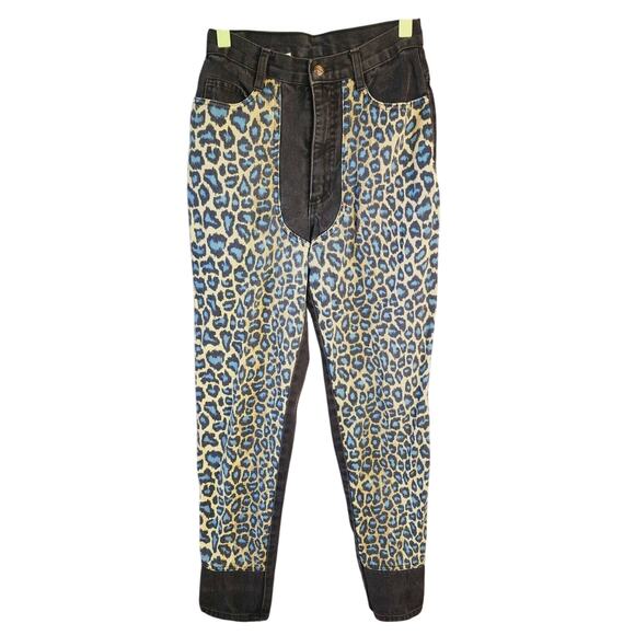 VTg 80s Fredericks of Hollywood Blue leopard Black Denim High Rise Jeans Sz 3 US