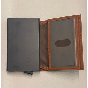 Sleek VULKIT pop-up wallet with integrated aluminum card case and quick-access trigger. Brown pebble leather cover (brand specs list RFID shielding), clear ID window, additional slip pocket, and slim bi-fold profile. Cards lift with one pull for easy access.