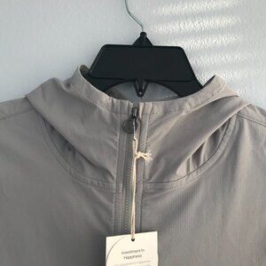 VUORI Excursion Ripstop Jacket. XL. Color is Fog (Grey). Lightweight, water-resistant ripstop windbreaker constructed with an adjustable hood and secure zip pockets. 85% recycled polyamide, 15% elastane. NWT