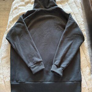 Oversized; Generous fit from chest through bottom, hits a mid-thigh