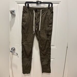 Introducing the Men's Ripstop Climber Pant by Vuori, the perfect fusion of style and sustainability. These pants feature a 33" inseam with a modern, tapered leg and are made from a sustainable blend of 98% Organic Cotton and 2% Elastane in a solid Dark Oregano color. Designed with practical details like mesh pockets and a zip pocket, they offer a comfortable elastic waistband with drawcord and a pull-on closure for effortless wear. Machine wash cold for easy care, and for those who prefer a relaxed fit, consider sizing up. Intended to be worn cuffed for a contemporary look.
