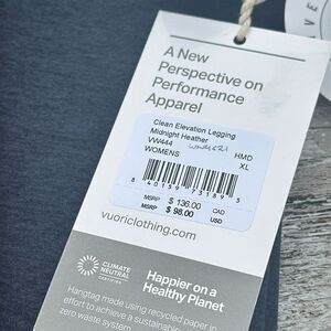 VUORI Clean Elevation Legging Dreamknit Move Leggings Midnight heather XL NWT High rise for high performance, elevate your legging game with the Clean Elevation Legging. Crafted with DreamKnit™ Move, our 87% recycled performance stretch knit, this perfectly simplified legging brings extra comfort and support to your active life–sans side pockets and seams.