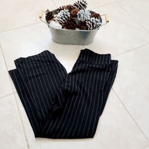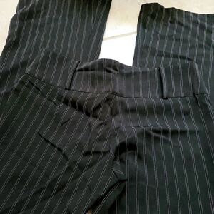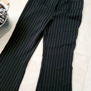 Juniors professional, white striped, black slack pants with belt loops and flare bottoms.
