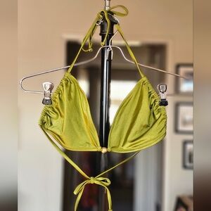 Chic olive green bikini set with adjustable ties and gold bead details. Perfect for vacations, lounging by the pool, or beach days!
