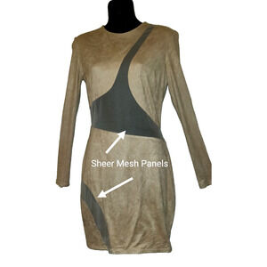 Va Va Voom Dress BODYCON Beige See-thru Mesh Panels Faux Suede Vintage Y2K M