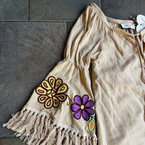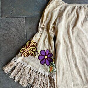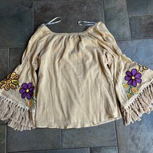 This blouse is a charming bohemian-style piece made from a wheat beige, textured cotton fabric with a natural, relaxed fit. It features a wide scoop neckline with a subtle drawstring tie detail at the center front for added charm. The most eye-catching design elements of this blouse are the dramatic bell sleeves, which flare out from the elbow and are adorned with a bold, colorful floral embroidery. Each sleeve showcases large embroidered purple flowers with yellow centers, accented by swirling green and orange leaves motifs. The sleeves are finished with thick, knotted fringe trim for an added dose of vintage flair and playful movement. The silhouette is relaxed and slightly flowy, making it both flattering and comfortable. Bodice is fully lined. This blouse pairs beautifully with jeans, shorts, or a maxi skirt for an effortless, boho-chic look. The blouse embodies a free-spirited, vintage-inspired aesthetic perfect for festivals or casual chic outfits.