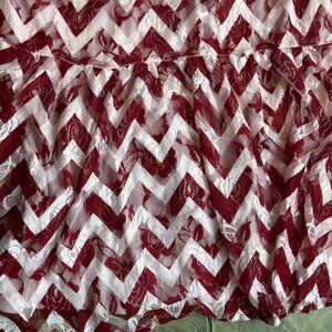 This striking, stylish strapless maxi dress offers a floor-length silhouette ideal for casual summer days or evening events. The dress features a bold chevron and understated floral pattern in alternating shades of burgundy, light pink, and white. The zigzag design adds a vibrant and eye-catching element to the dress. The outer fabric is a super soft, semi-sheer mesh material, lightweight fabric, but the dress is fully lined for comfort and coverage. The bodice is ruched and fitted around the bust, providing structure and shape. The empire waist design flows into a relaxed, flared skirt, enhancing its feminine silhouette. The dress has a tiered bottom with a gathered ruffle, adding movement and a bohemian flair. Though it is strapless, the top has a slight ruffle overlay around the chest area, offering a soft and romantic touch.