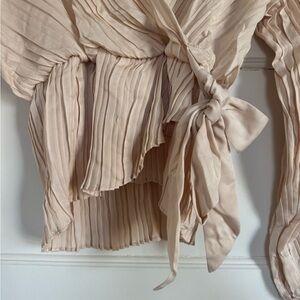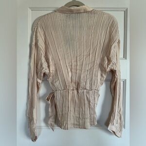 Elegant pleated wrap blouse. Features a stylish tie at the waist. Perfect for any occasion.