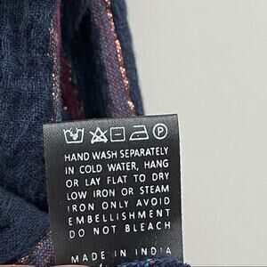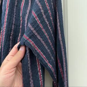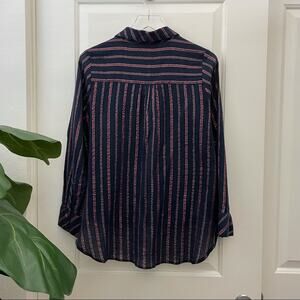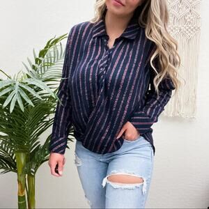Navy, teal, purple, maroon and rose gold striped surplice button twist blouse. Collared.