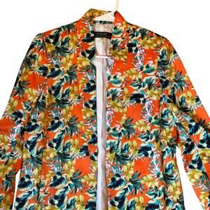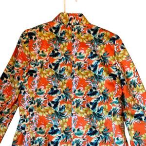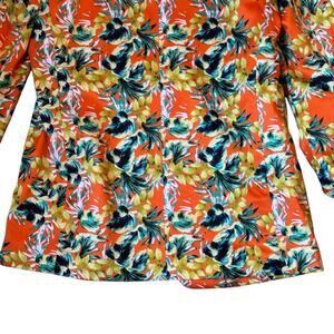 • Vibrant tangerine-orange with tropical floral print in shades of blue, green, and yellow