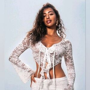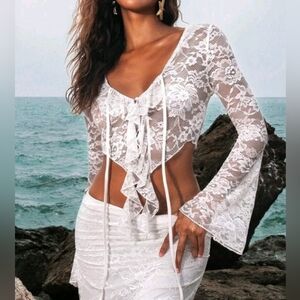 Vacation Solid Color Knit Lace Bell Sleeve Women Blouse
