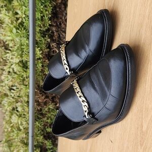 Elegant Vagabond bit loafers in black leather with eye-catching gold tone chain decoration in front and comfortable rubber sole.