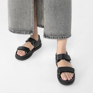 Minimal sandals Erin has a pared down, clean design. The monochrome upper is made from black leather featuring a two-strap design with hook-and-loop fastening, open toes and moulded insoles. The style is grounded by tonal rubber outsoles measuring 40 mm.