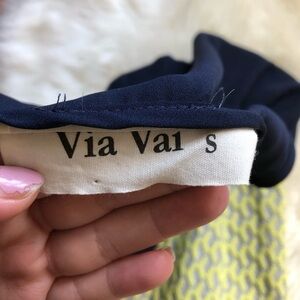 Shorts are yellow/lime green color with adorable ruffled hem. Top is lightweight blue material, no closure at front. Unlined.